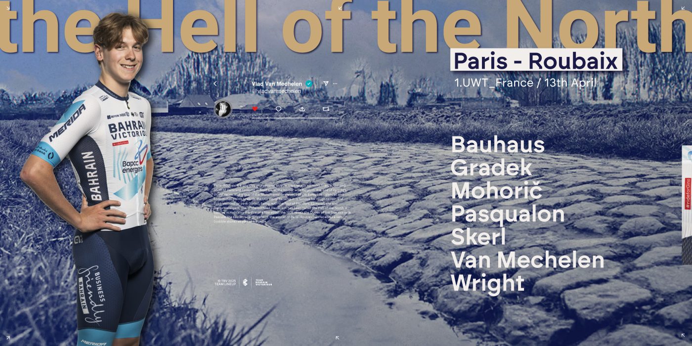 Sports Director Aart Vierhouten is eager to get things underway at Paris-Roubaix: “Fred Wright and Matej Mohorič, both of whom have already had strong performances here in the past, will lead our team on Sunday. We’ve built a solid support crew around them: Kamil Gradek and Andrea Pasqualon will play key roles in positioning, while two of our promising young talents – Vlad van Mechelen and Daniel Skerl – will add strength and grit. Vlad, being Belgian, feels at home on the cobbles and has already proven he knows how to navigate them well. Daniel showed good legs and resilience both in Belgium and in Denain, and we believe he deserves this opportunity. Rounding up the team is Phil Bauhaus, who will use his great positioning skills for the team leaders into the cobbled section as well.”