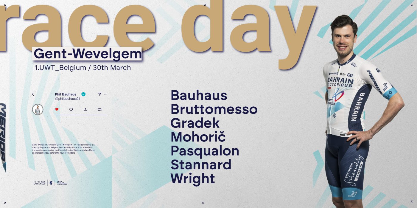 Team Bahrain Victorious head into Gent-Wevelgem with a versatile roster capable of delivering results in both a selective race and a bunch sprint. The team welcomes back Phil Bauhaus, who returns to the line-up for the third of the Spring Classics, while Fred Wright will be eager to bounce back after a challenging E3 and rediscover the strong form he showed at Milan-San Remo.