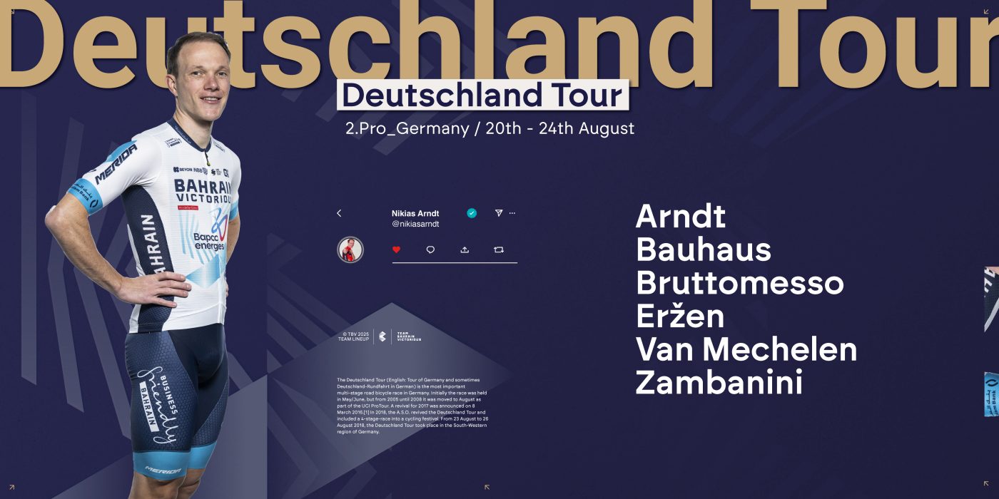 Bahrain Victorious line up with Nikias Arndt, Phil Bauhaus, Alberto Bruttomesso, Žak Eržen, Vlad Van Mechelen, and Edoardo Zambanini. The team will back Bauhaus and Eržen in the sprints, aiming to capitalise on the fast finishes in Herford and Magdeburg. Arndt and Bruttomesso bring strength to the sprint train and depth on the hillier stages, while Zambanini and Van Mechelen will lead the team’s GC ambitions. This versatile lineup ensures Bahrain Victorious remain a factor across every stage.