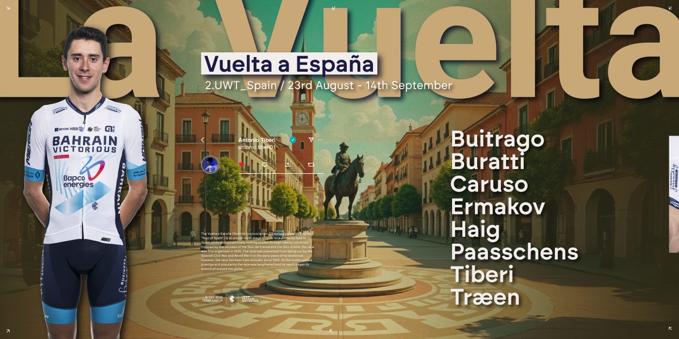 Bahrain Victorious’ leader for La Vuelta 2025 is Antonio Tiberi, making his fourth appearance at the race. The 24-year-old Italian climber is eager to deliver his best after being forced to abandon last year due to heatstroke on Stage 9, when he was riding strongly, wearing the best young rider’s jersey, and fighting for the GC podium.