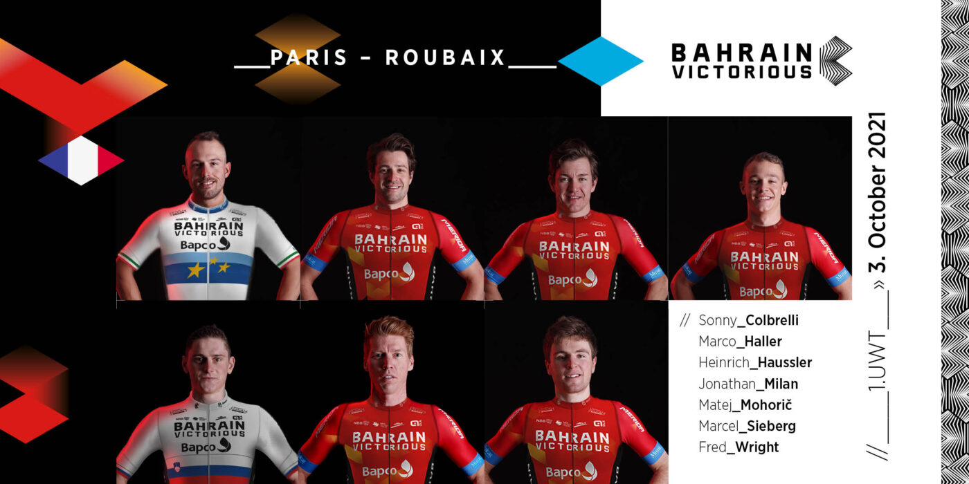 Bahrain Victorious lineup for Paris-Roubaix: Sonny Colbrelli, Marco Haller, Heinrich Haussler, Jonathan Milan, Matej Mohorič, Marcel Sieberg, Fred Wright.