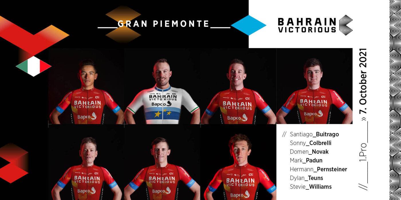 Bahrain Victorious lineup for GranPiemonte: Santiago Buitrago, Sonny Colbrelli, Domen Novak, Mark Padun, Hermann Pernsteiner, Dylan Teuns, Stevie Williams.