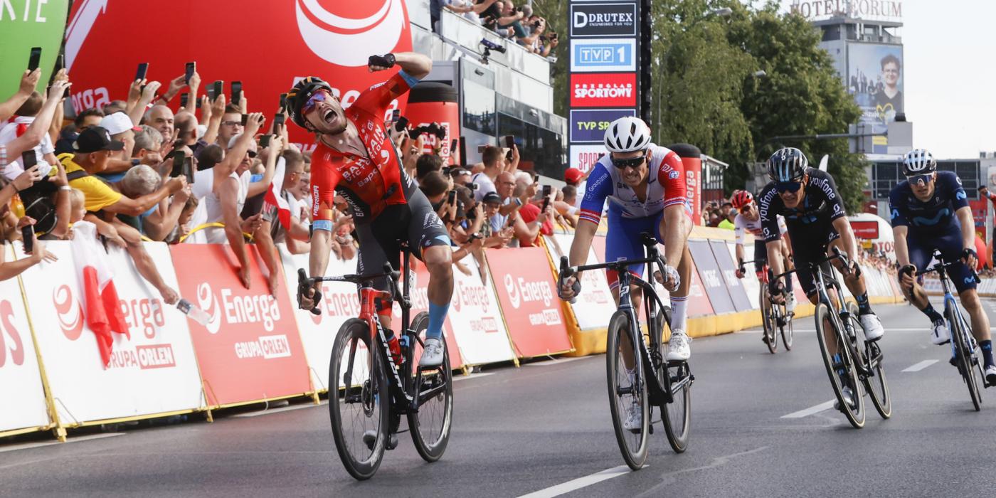 After top 3 results for Bahrain Victorious in each and every stage so far, Phil Bauhaus capped off an extraordinary day and week of teamwork at the Tour de Pologne, raising his arms in triumph in Rzeszów.
