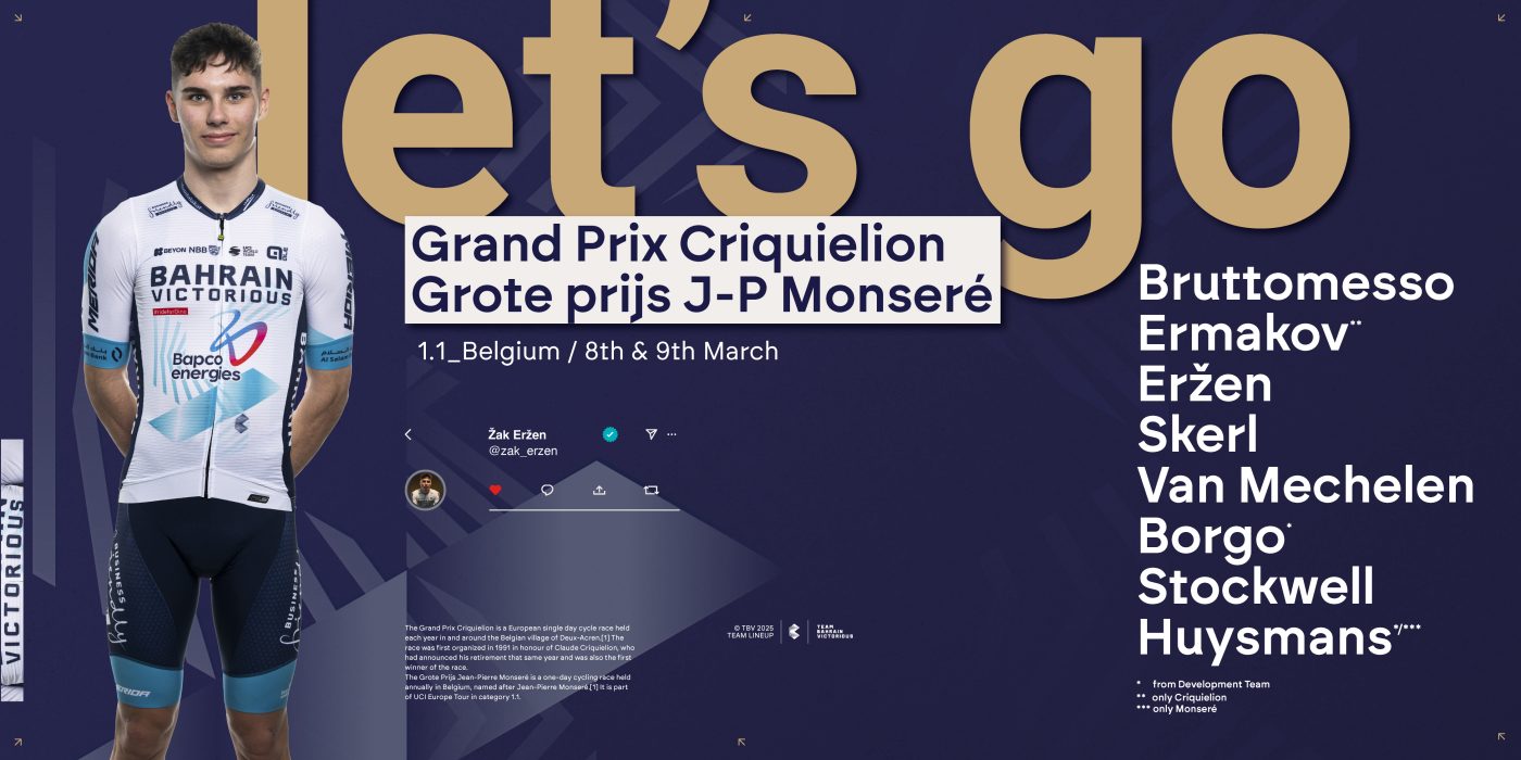 Team Bahrain Victorious is set to continue its Belgian campaign with a motivated squad heading into Grand Prix Criquielion (March 8) and GP Jean-Pierre Monseré (March 9). After a promising showing at Le Samyn, the team remains focused on development, with a blend of WorldTour and development riders eager to gain more valuable racing experience on the Belgian roads.