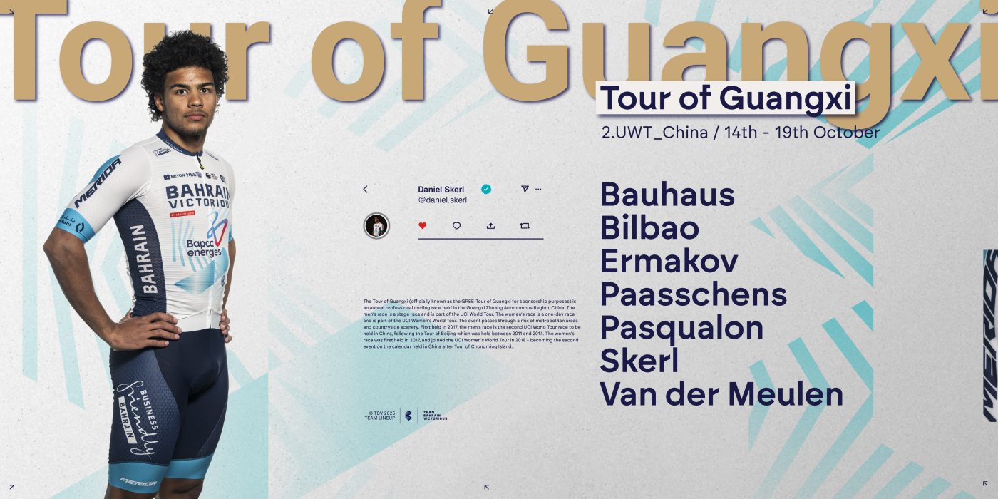 In 2025, Team Bahrain Victorious return with one of our strongest line-ups yet, with a clear dual focus. Phil Bauhaus will lead the team as the designated sprinter, aiming to seize any of the five sprint opportunities. The German achieved two top-five finishes in his first Tour of Guangxi appearance back in 2019, and returns to face this redesigned course. He will be supported by Andrea Pasqualon and Daniel Skerl in the lead-out, making up a formidable trident ready to contest stage victories.