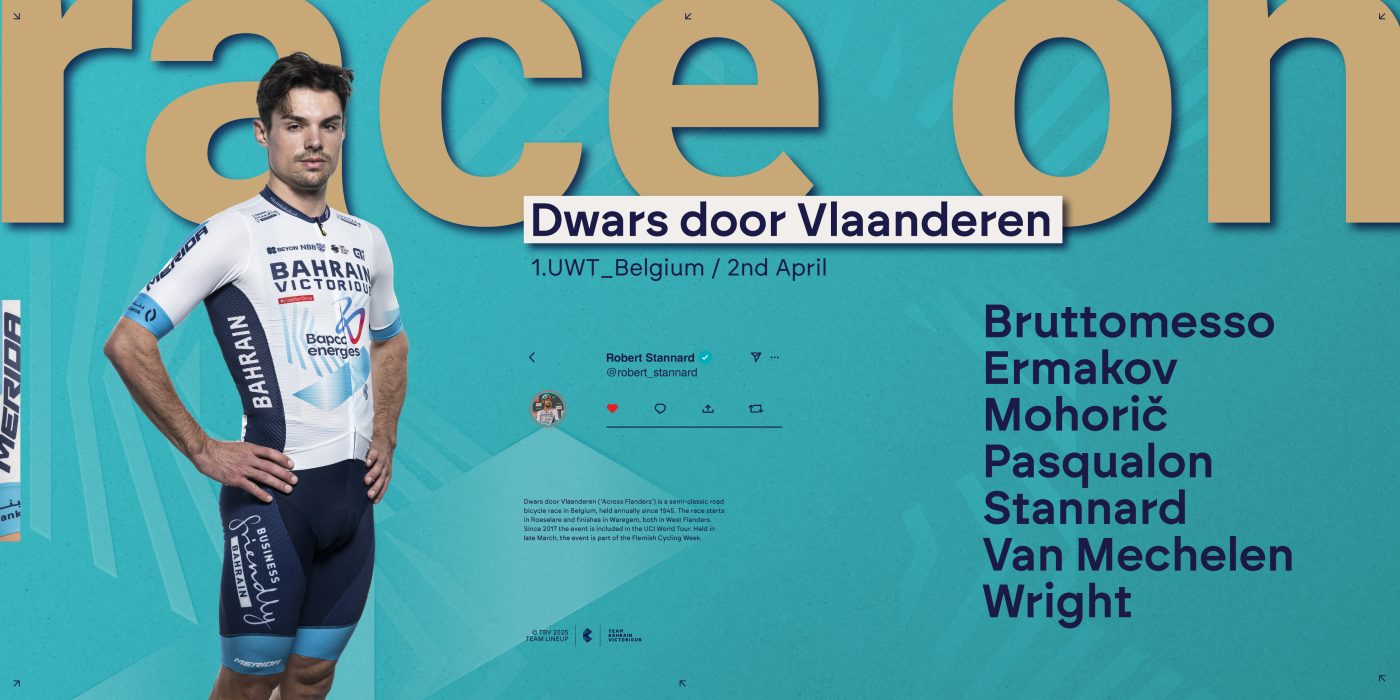 Team Bahrain Victorious is set for the 79th edition of Dwars door Vlaanderen, the fourth and final rehearsal ahead of the Ronde van Vlaanderen on 6 April. The team heads into Wednesday’s race looking to bounce back after a difficult outing at Gent-Wevelgem.